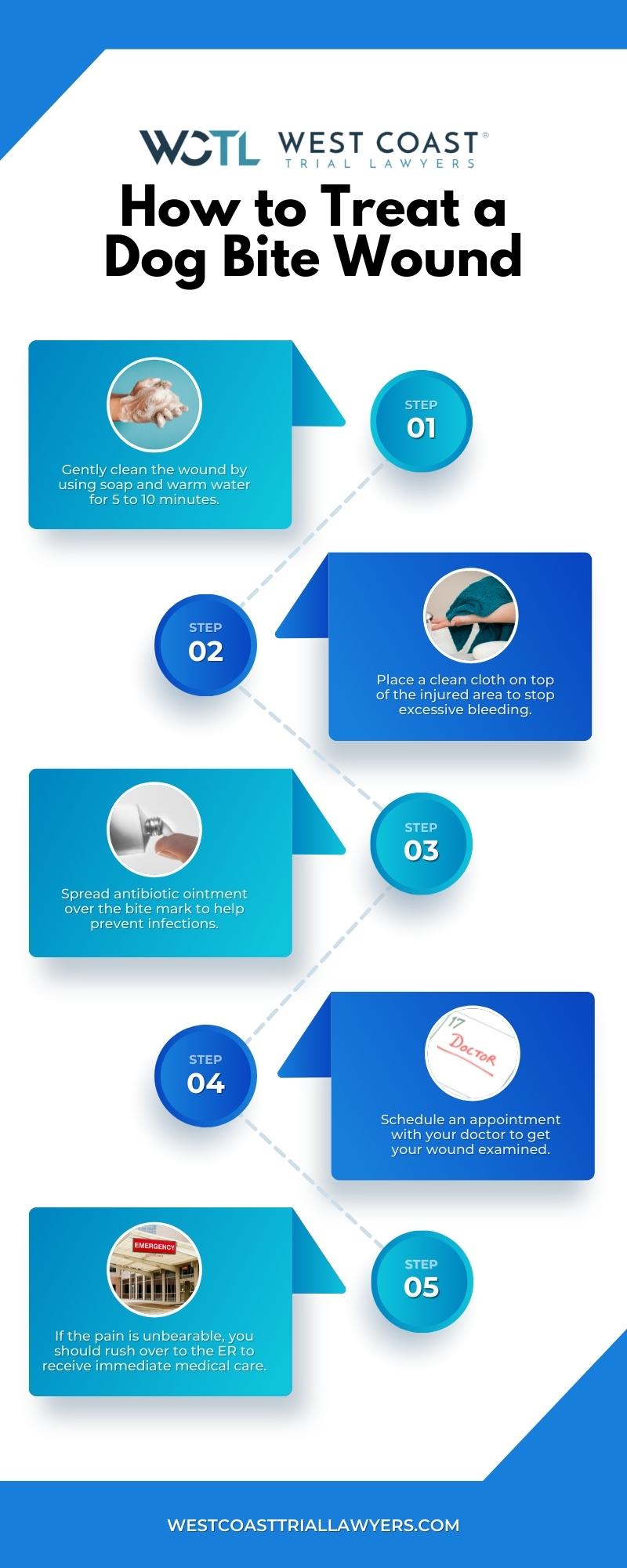 After the dog has released its fangs from your skin, you should immediately wash the wound by using soap and warm water for 5 to 10 minutes. Once you have completed this step, you should get a clean cloth and place it over the bitten area to slow down the bleeding. Next, you should apply antibiotic cream over the wound and have it wrapped in a sterile bandage. The final step would be to contact your doctor and set up an appointment to have your wound examined. The doctor will run tests to determine whether you have any serious skin damage or infections. If your bite is unbearable to handle until your doctor’s appointment, you should visit the ER as soon as possible. The doctor will diagnose your condition right away and create a treatment plan that will help with your recovery.