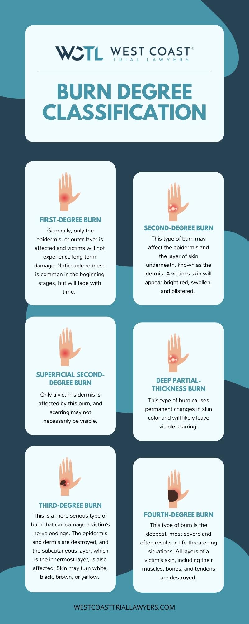 Burn injuries are generally identified depending on severity. Burn classification is one of the most important considerations a burn injury attorney will analyze when determining liability and potential damages. The more severe a burn was, the greater the likelihood that medical costs associated with treating resulting injuries will be. For the most part, more severe injuries translate into greater compensation.