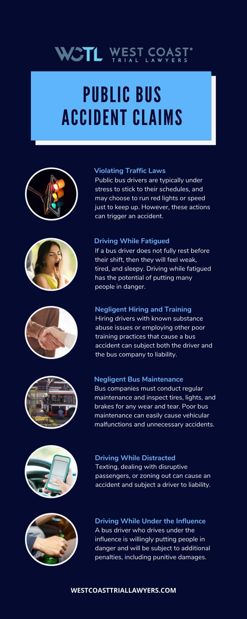 • Violating traffic laws. Part of a bus driver’s duty as a common carrier is as simple as following traffic laws and obeying traffic signals. Failure to do so may result in bus driver liability and cause a potentially serious accident. Public bus drivers are typically under stress to stick to their schedules, and may choose to run red lights or speed just to keep up. However, these are severely negligent behaviors.