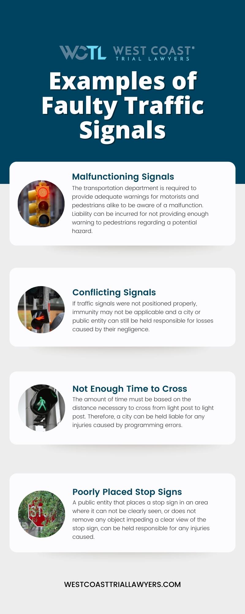 • Malfunctioning signals. When it comes to malfunctioning traffic signals, a transportation department is required to provide adequate warnings for motorists and pedestrians alike to be aware of the malfunction. Liability can be incurred for not providing enough warning to pedestrians regarding a potential hazard.