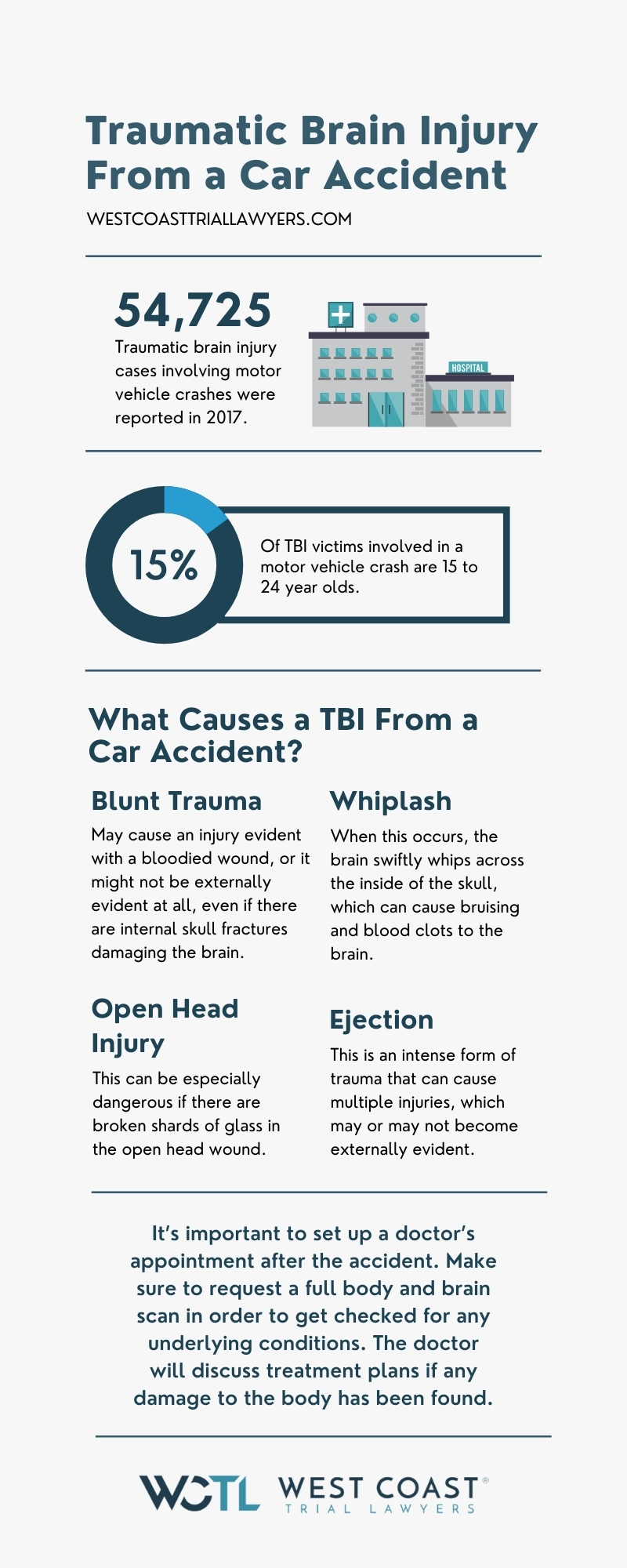 In the sections below, our expert personal injury attorneys at West Coast Trial Lawyers will go more into detail about how TBIs occur after a car accident, what you should do to treat your symptoms, and how to file a claim against the negligent party at-fault for causing your TBI.