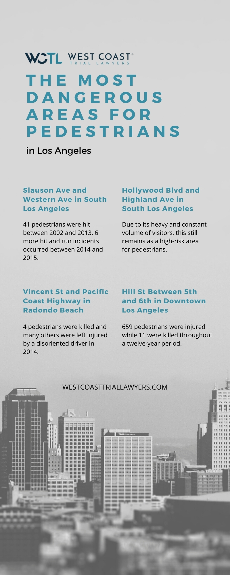 With your safety in mind, our knowledgeable Los Angeles pedestrian accident attorneys at West Coast Trial Lawyers have compiled the most dangerous intersections for pedestrians in Los Angeles County. If you or a loved one was wounded in a pedestrian crash in Los Angeles, we are always here to help you. We will recover all the compensation you are entitled to so that you can focus on your recovery and on the ones you care most about.