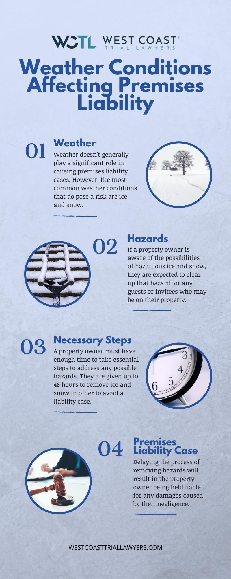 In California, bad weather doesn’t generally play a large role in causing premises liability accidents. The most common weather conditions that may present an accident risk, however, are ice and snow.