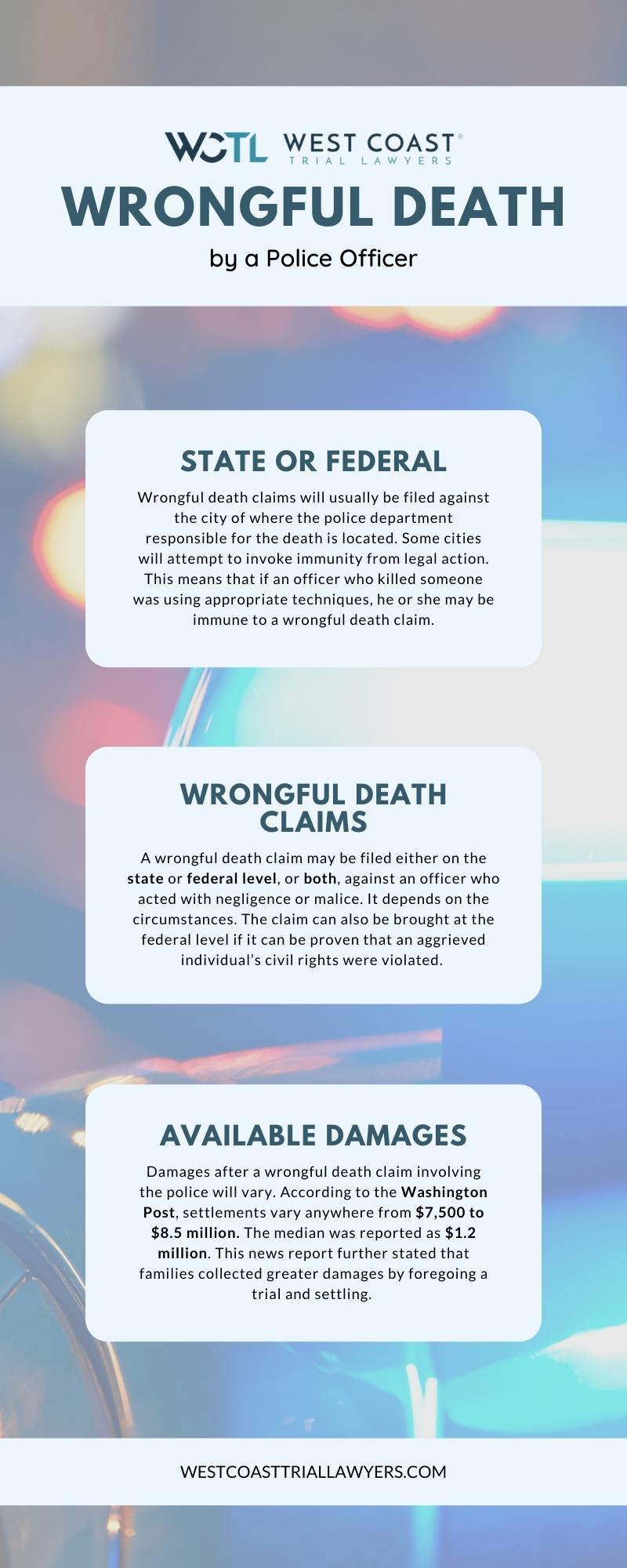 Damages after a wrongful death claim involving the police will vary. For example, according to the Washington Post, settlements vary anywhere from $7,500 to $8.5 million. The median was reported as $1.2 million. This news report further stated that families collected greater damages by foregoing a trial and settling. Finally, very few cases have ever been brought against individual police officers.