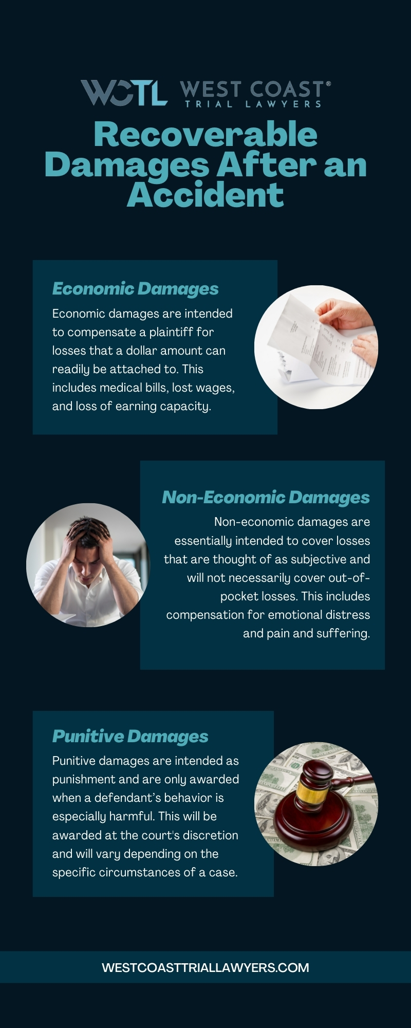 Los daños económicos están destinados a compensar al demandante por las pérdidas a las que se puede adjudicar fácilmente una cantidad en dólares. Se calcula determinando la cantidad de pérdidas de bolsillo que una persona agraviada tiene o en que puede incurrir como resultado de sus lesiones. Los ejemplos de daños económicos incluyen la pérdida de la capacidad de generar ingresos, las facturas médicas y la pérdida de salarios.
