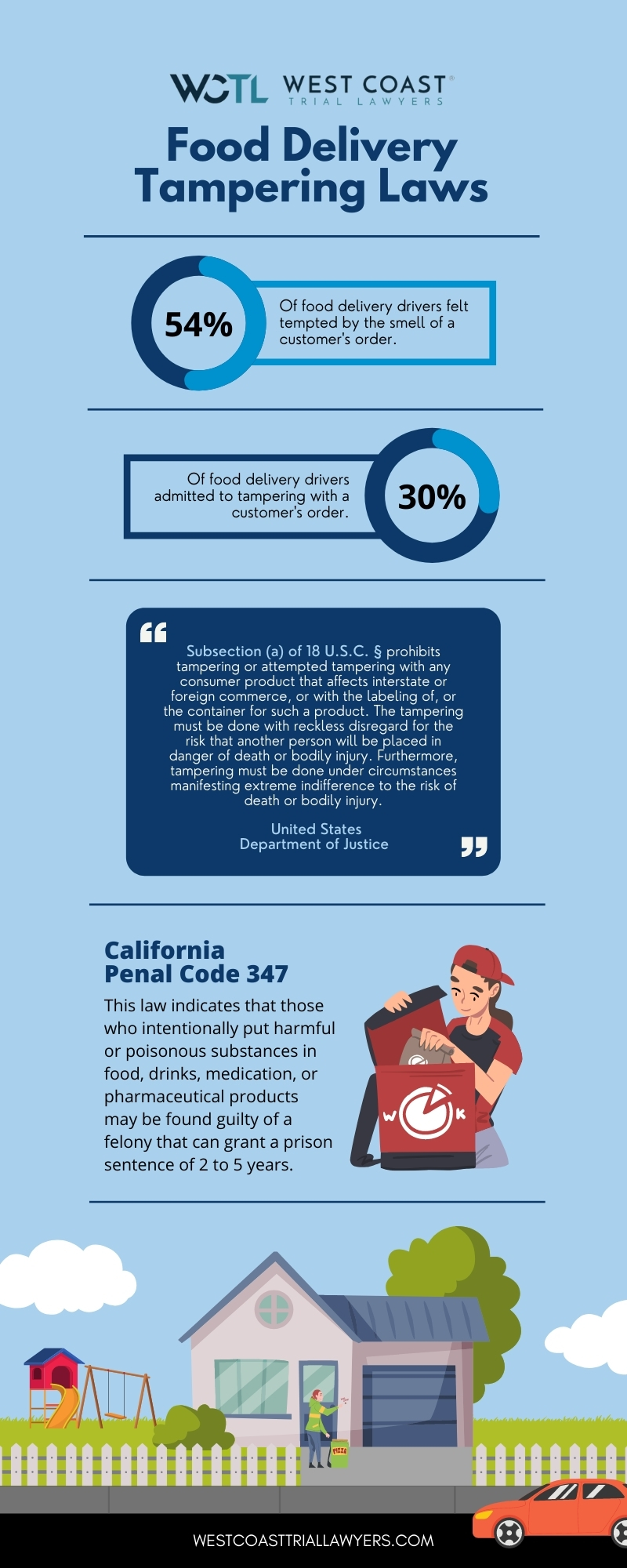 It has been reported that nearly 54 percent of food delivery drivers have been tempted by the smell of a customer’s food, while 30 percent have actually reached in to steal some for themselves. If the food becomes contaminated and causes the customer to become ill, the delivery driver may face legal repercussions.