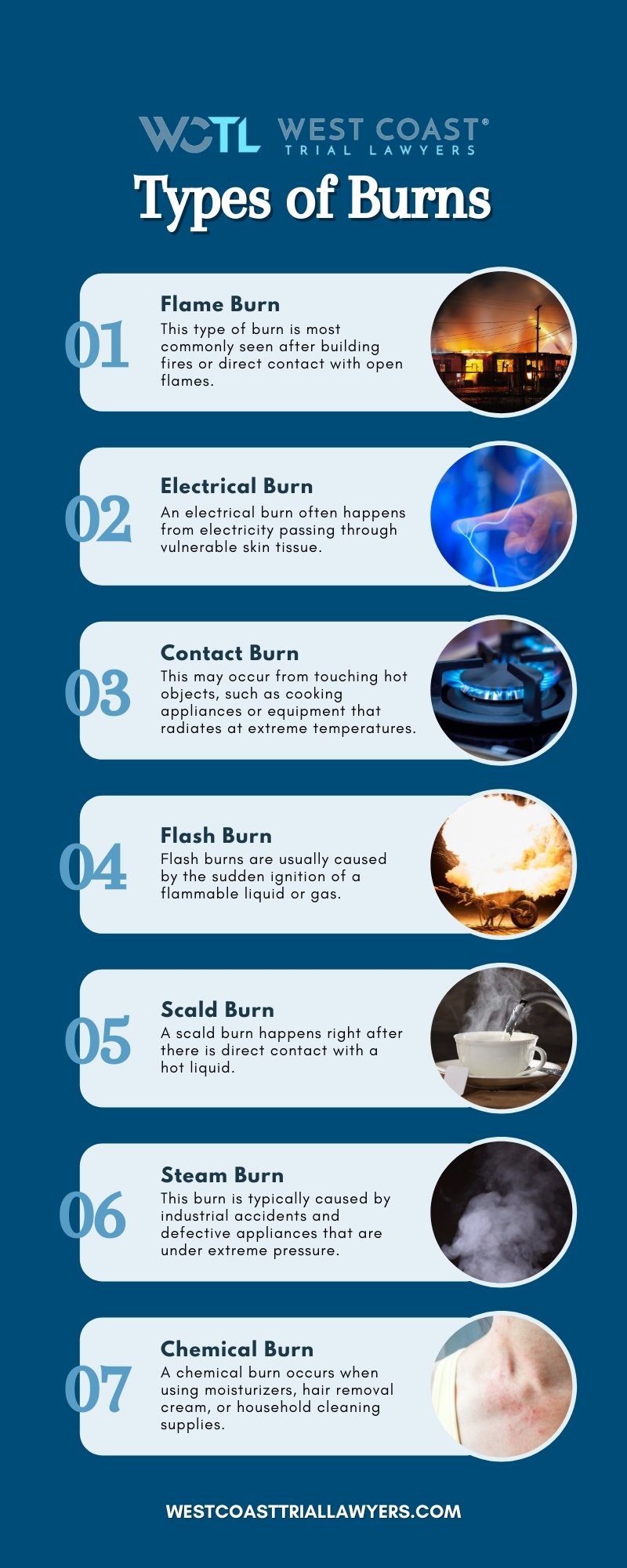 • Steam Burn: This burn is typically caused by industrial accidents. However, they can also be caused by defective appliances that are under extreme pressure.