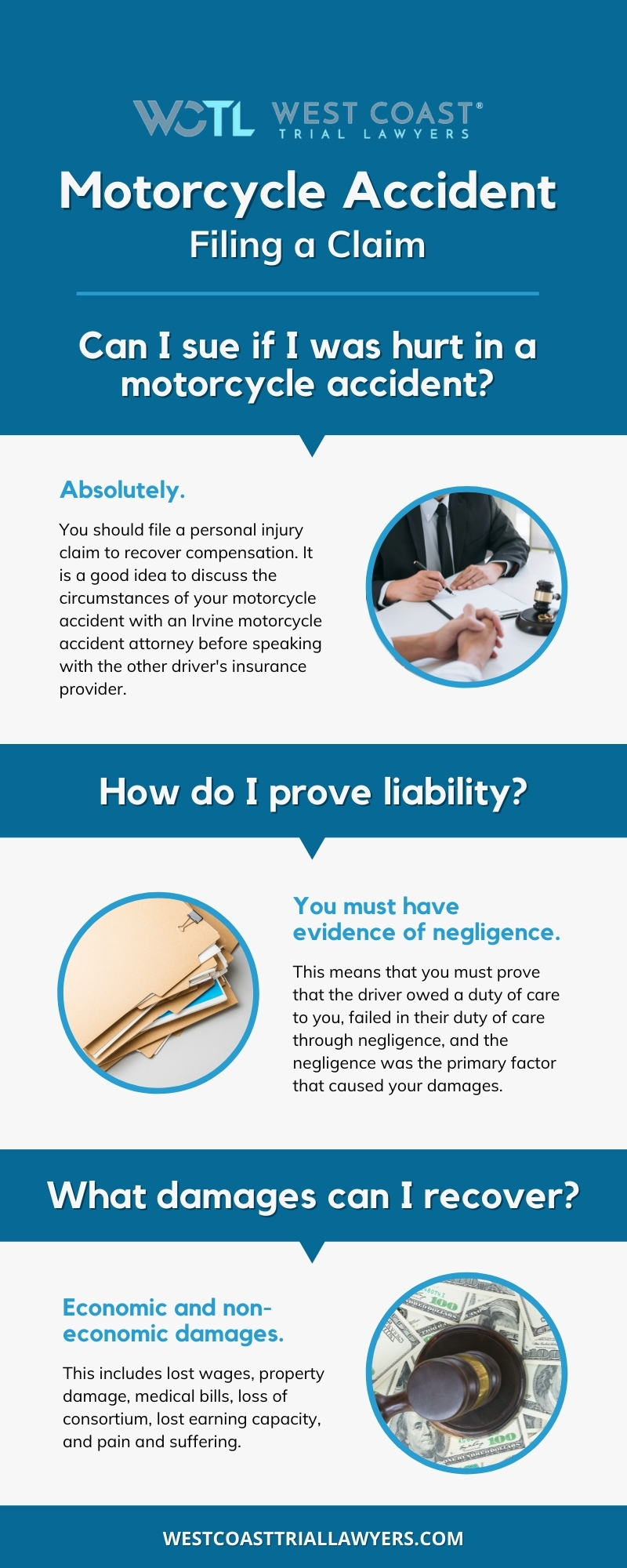 If you have sustained injuries in a motorcycle accident as a result of someone’s negligence or deliberate acts of malice, you have the right to hold the guilty party responsible for your losses. An Irvine motorcycle accident attorney at West Coast Trial Lawyers can help recover compensation for the losses you have suffered.