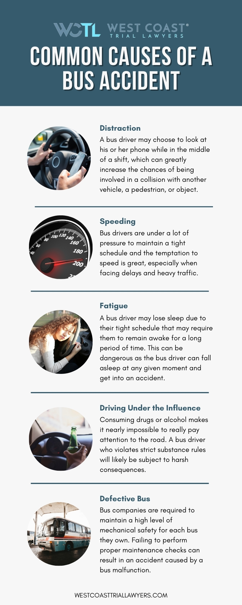 - Distraction. A common distraction is cell phone usage. A bus driver may, unfortunately, choose to look at his or her phone while driving, which can greatly increase the chances of a collision with another vehicle, pedestrian, or object.