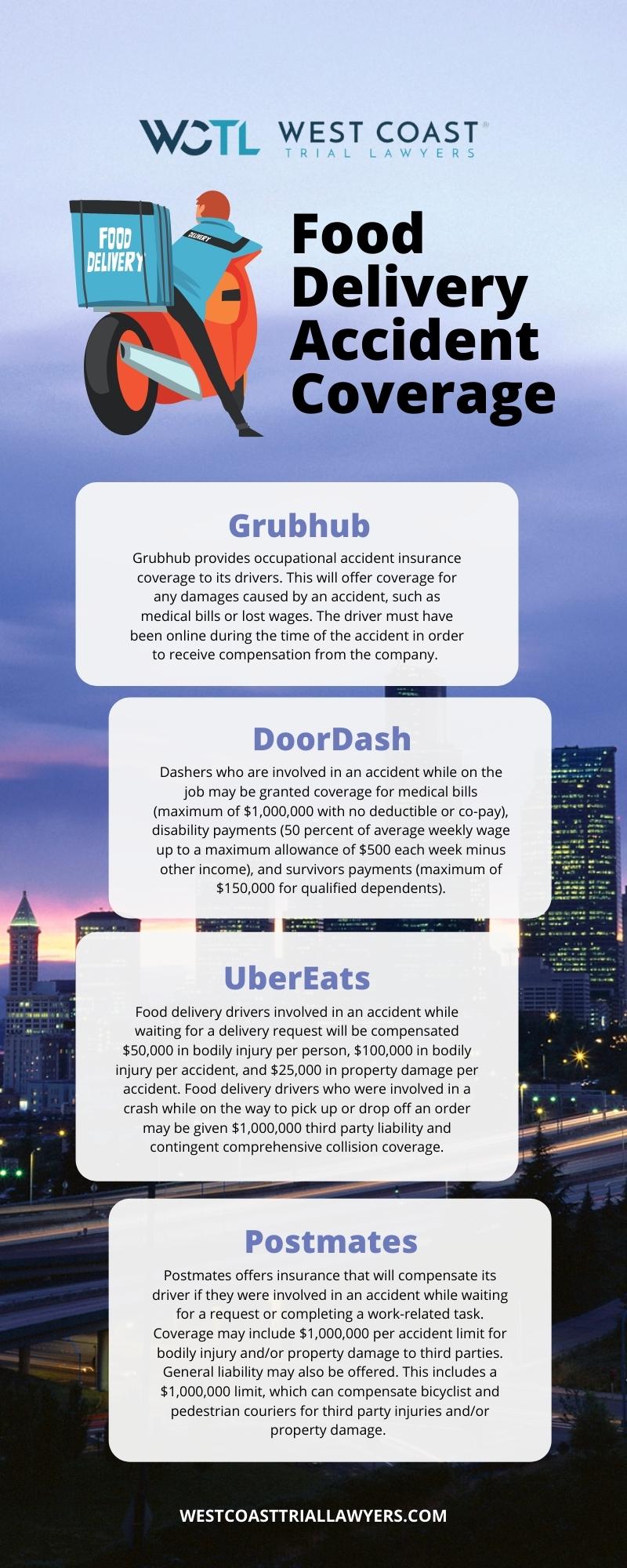 Food delivery drivers may be awarded coverage by the food delivery company they work for depending on whether they were online when the accident occurred. If it can be proven that the food delivery driver was waiting for a request, headed to pick up an order, or on the way to drop off an order, then the company they work for will provide them with compensation that their personal auto insurance is unable to cover on their own. Below, we will discuss more in depth of what each food delivery company has to offer to its drivers.