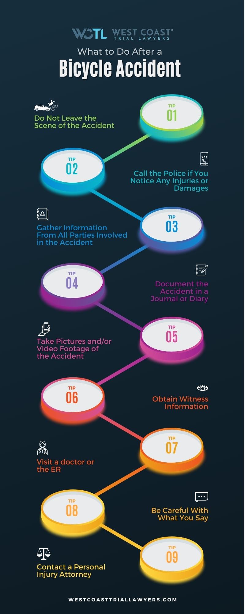 - Be careful with what you say. You may be flooded with emotions after the bicycle accident, however, you will need to keep your opinions to yourself. Furthermore, you should never apologize or suggest who may be at-fault for causing the bicycle accident. These statements can be used against you by the other party.