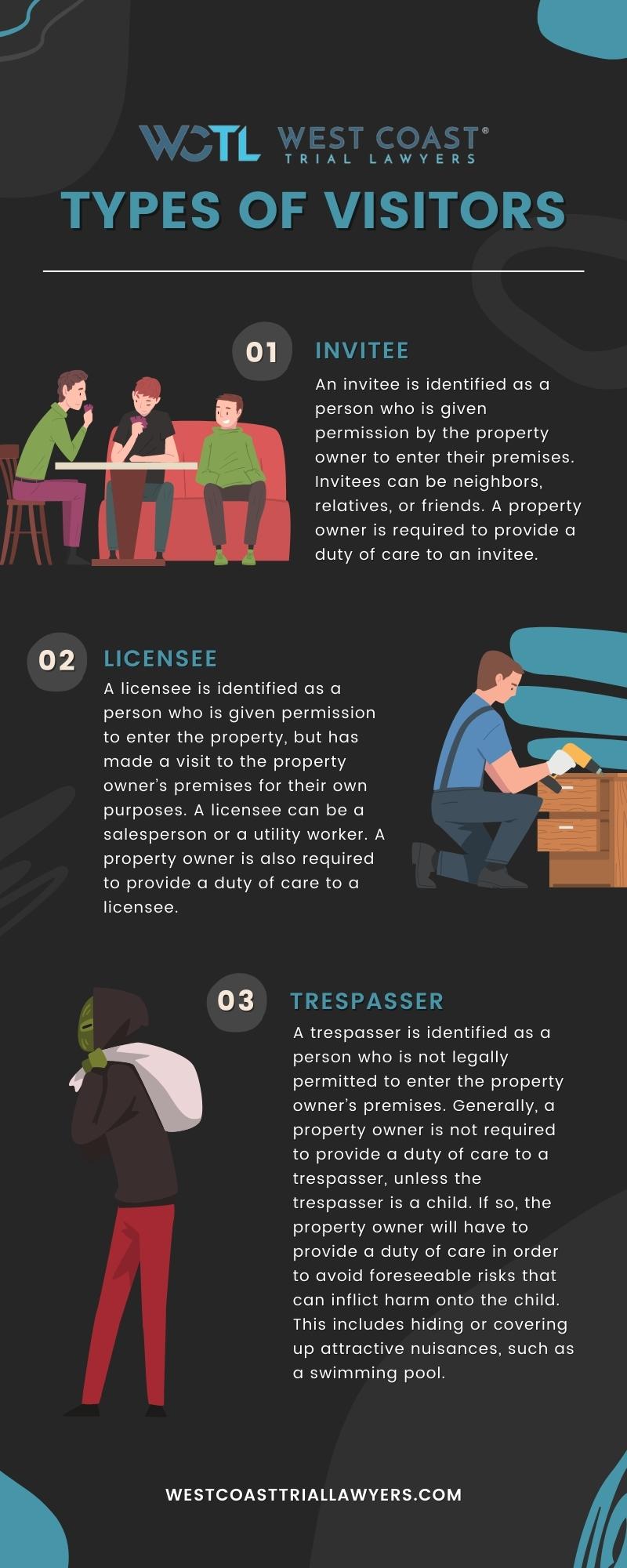 - Invitee. An invitee is identified as a person who is given permission by the property owner to enter their premises. Invitees can be neighbors, relatives, or friends. A property owner is required to provide a duty of care to an invitee.