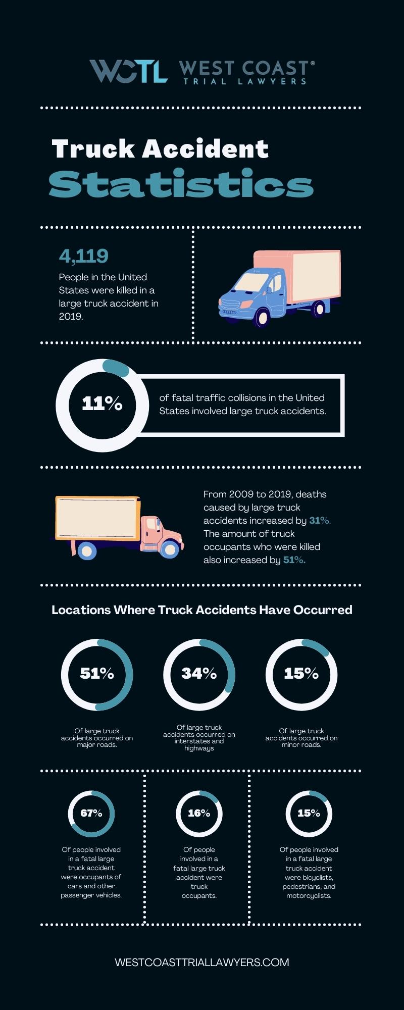 From 2009 to 2019, deaths caused by large truck accidents increased by 31 percent. The amount of truck occupants who were killed also increased by 51 percent.
