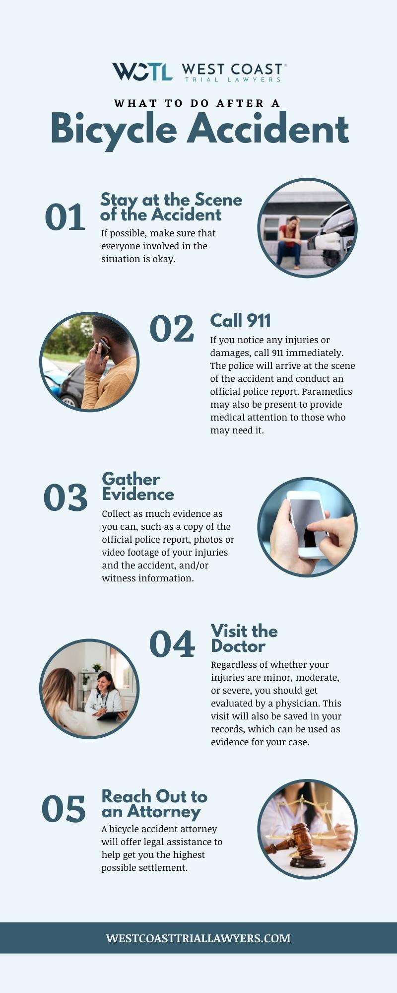 • Reach out to a personal injury attorney. Do not make any rash decisions without getting the opinion of an experienced Pasadena personal injury lawyer. At West Coast Trial Lawyers, our attorneys are always available to help with personal injury cases, especially those that involve bicycle accidents. We will provide you with legal guidance and advice to make sure that you recover the highest possible settlement.