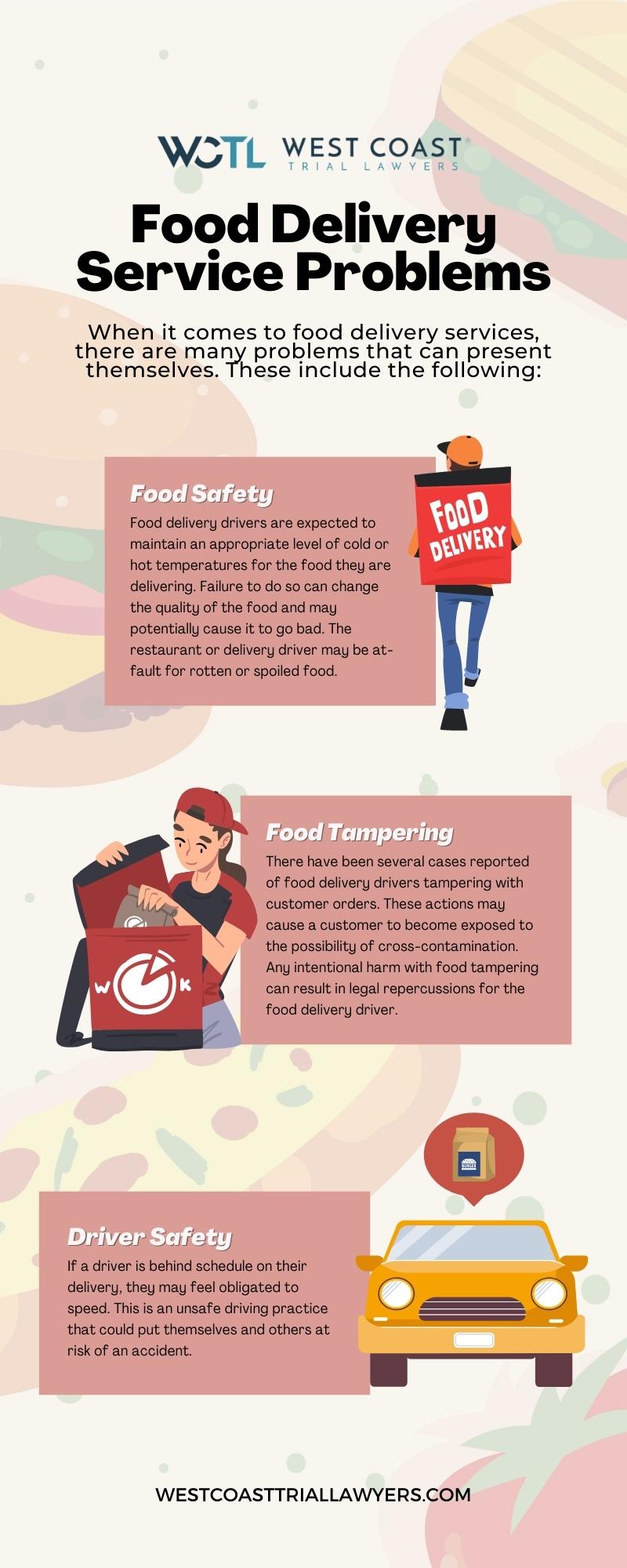 - Food safety. This is a major priority. Food delivery drivers are expected to maintain the appropriate cold or hot temperatures for the food they are delivering. Failure to do so can change the quality of the food and may potentially cause it to go bad. The restaurant or delivery driver may be at-fault for this type of problem if someone becomes ill as a result of rotten or spoiled food. An investigation will commence to determine who will be held liable for the expired food.