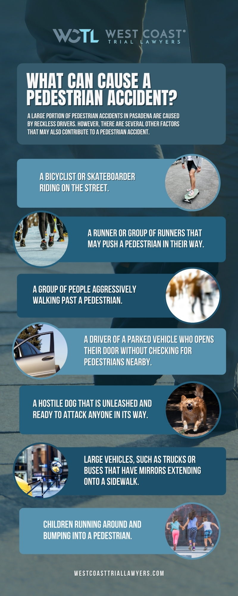 A large portion of pedestrian accidents in Pasadena are caused by reckless drivers. However, there are several other factors that may also contribute to a pedestrian accident. This includes the following:
