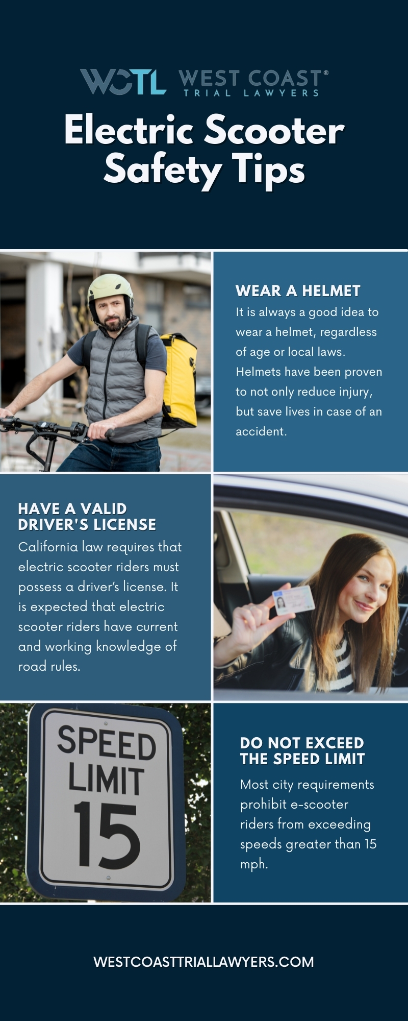 - Retain a valid driver’s license. California law requires that electric scooter riders must possess a driver’s license. It is expected that electric scooter riders have current and working knowledge of road rules.