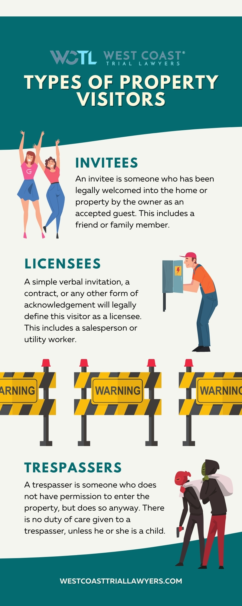 California law mandates that all property owners must maintain a reasonably safe environment for those who enter their property. The law separates people who enter a property into three categories: Invitees, licenesses, and trespassers.