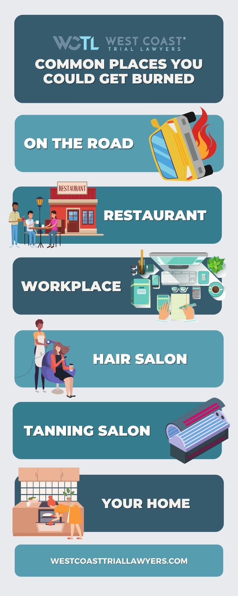 6. Your own home. Many burn injuries have happened in a person’s household. The most common burn injury occurs when you are cooking solid or liquid foods. The light switch or power plug may also cause an electric burn if you are hit with intense electricity. Under these types of circumstances, you can be covered by homeowners insurance or your personal health insurance.